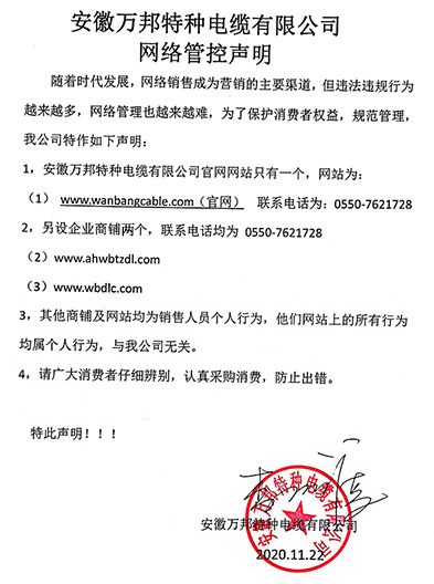 鄭重聲明:安徽萬邦特種電纜有限公司官方網(wǎng)站為:www_wanbangcable_com.wiyq.cn,除此之外無任何子網(wǎng)站或合作網(wǎng)站,其余均為假冒偽劣。電話:0550-7621728 13485756353 地 址:安徽省天長市滁州高新技術產(chǎn)業(yè)開發(fā)區(qū)經(jīng)四路29號